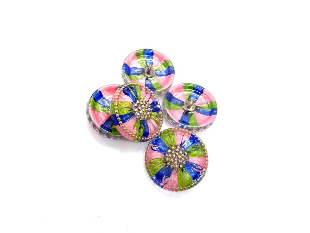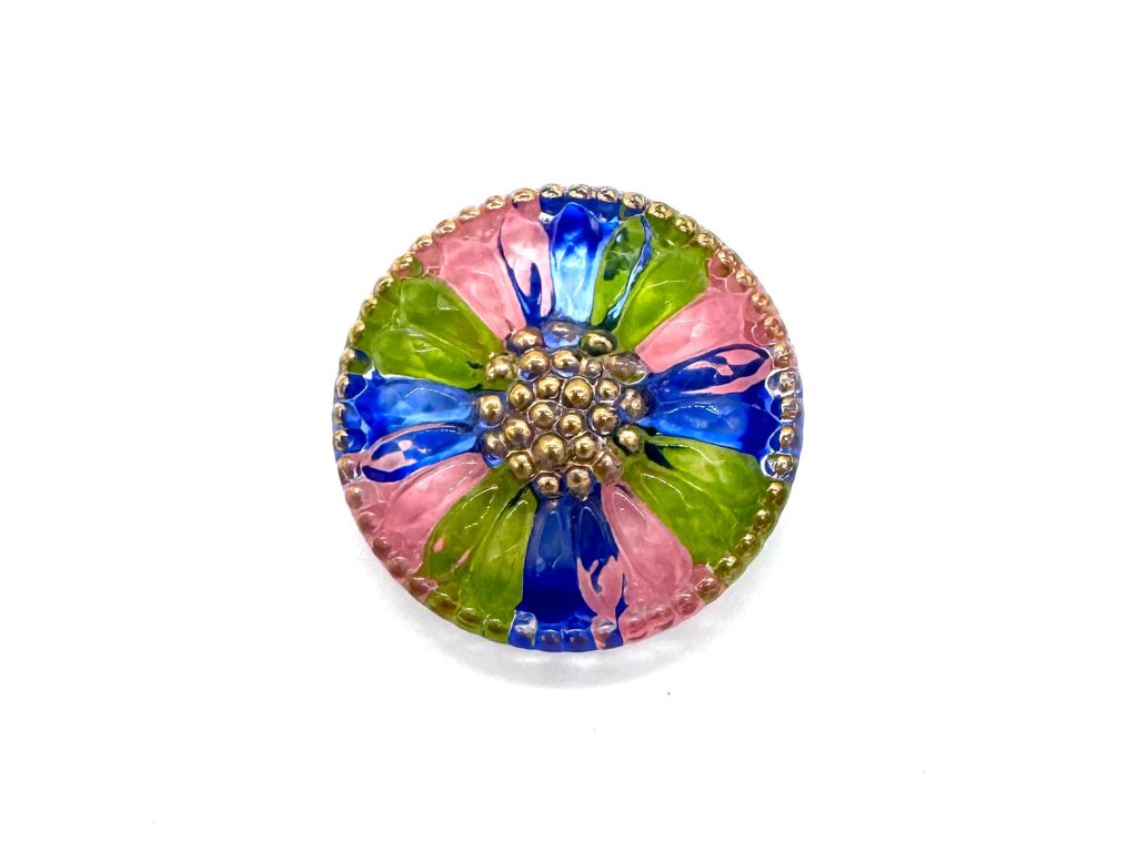 Objevte krásu v našem ručně vyráběném knoflíku o průměru 22,5 mm. Knoflík je tvořen z kvalitního transparentního skla s malováním na spodní straně knoflíku. Tento knoflík krásně rozzáří jakýkoli oděv či ruční dekoraci.
